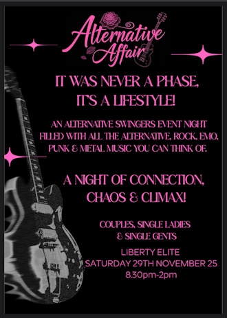 Alternative Affair is the ultimate alternative swinging experience, drenched in black lace, leather, and neon heat.