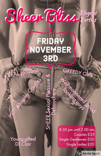 We co-host this event with SHEER BLISS Players Parties who aim to bring sexual energy to Friday Nights. Sheer Bliss want to entice real players and genuine Greedy Girls, along with well-mannered good looking guys and lots of Hot Raunchy Couples as well.