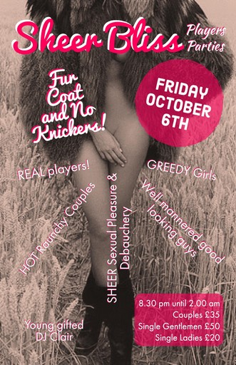 SHEER BLISS Players Parties aim to bring sexual energy to Friday Night People on the first Friday of every month. Sheer Bliss want to entice real players and genuine Greedy Girls, along with well-mannered good looking guys and lots of Hot Raunchy Couples as well.