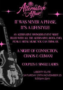 Welcome to Alternative Affair… Where it was never a phase, it’s a lifestyle. Step into the shadows and lose yourself in a night of dark glamour, pulsing with raw energy and unfiltered desire. Alternative Affair is the ultimate alternative swinging experience, drenched in black lace, leather, and neon heat. Think sexy goths, emo icons, and punk rock lovers colliding on the dancefloor in a seductive symphony of eyeliner, fishnets, and filthy riffs. Curate your own filthy playlist, dress to thrill,…