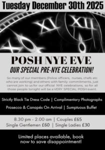 This event will be open to couples, single gentlemen and single ladies, so we can all make it a night to remember. So many of our members (Police officers, nurses, chefs etc who are working) and others with family commitments, just cannot join to us for tomorrows celebrations, so for all those people tonight will be a VERY SPECIAL POSH event. The Dress Code is important so black tie for the gentlemen or at least a minimum of Smart shirt…